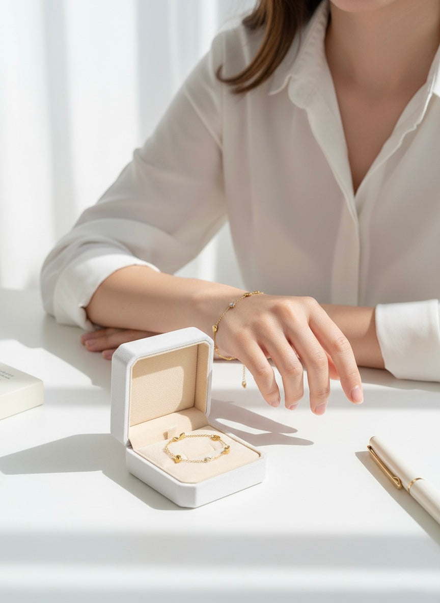 This bracelet features delicate golden heart charms, arranged to create a graceful, flowing rhythm around the wrist. Its understated elegance makes it a versatile piece — perfect for everyday wear or a refined statement.
