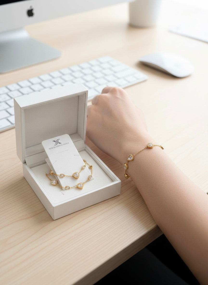 This bracelet features heart-shaped diamonds, each capturing light with a soft yet brilliant glow. The delicate repetition of hearts creates a graceful rhythm, blending romance with refined luxury.