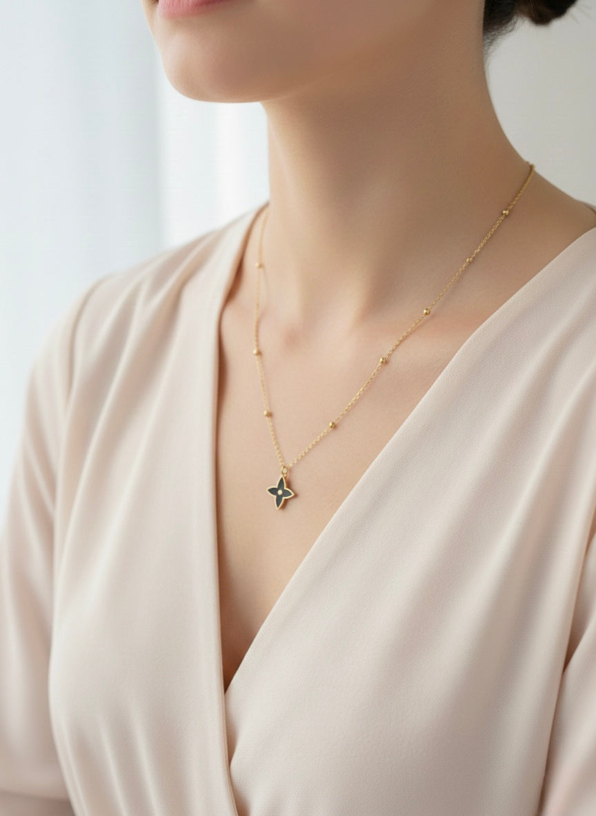 The black star pendant symbolizes guidance through darkness, a celestial light that shines even in the unseen realms. Set against a refined gold-toned chain, the contrast evokes strength, allure, and timeless elegance.