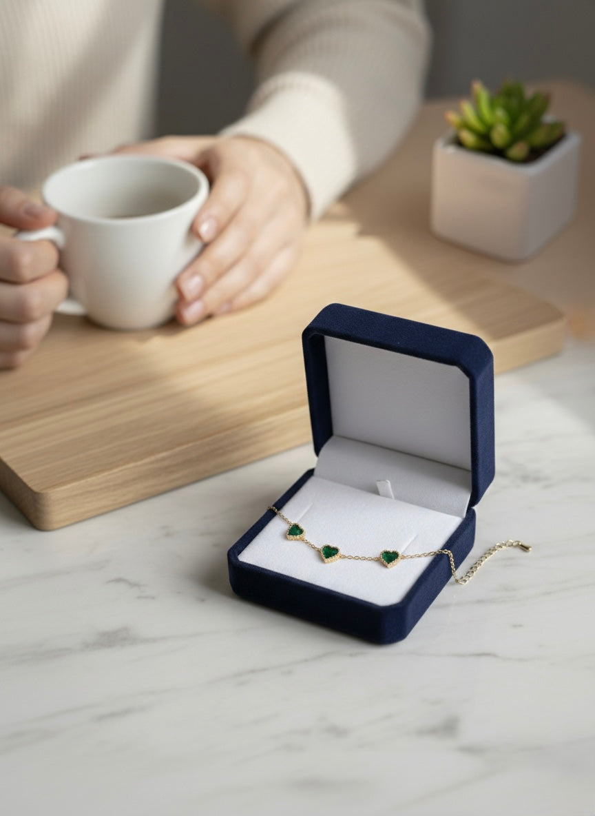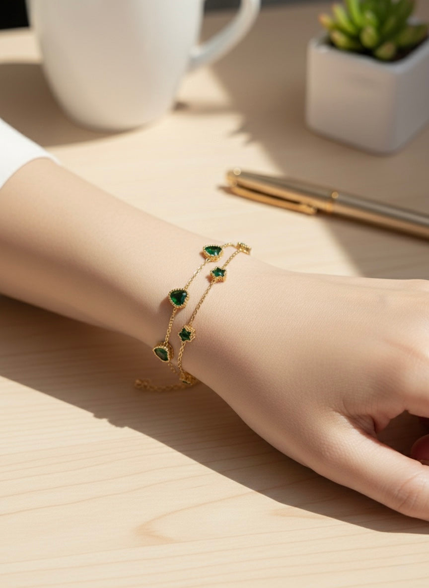 The green heart-shaped stones echo the vitality of the earth itself: lush forests, deep roots, and the steady rhythm of growth. Their radiant hue symbolizes healing, compassion, and the unwavering resilience found in nature’s core. Set against a polished gold-plated stainless steel band, the contrast evokes purity, elegance, and timeless serenity.