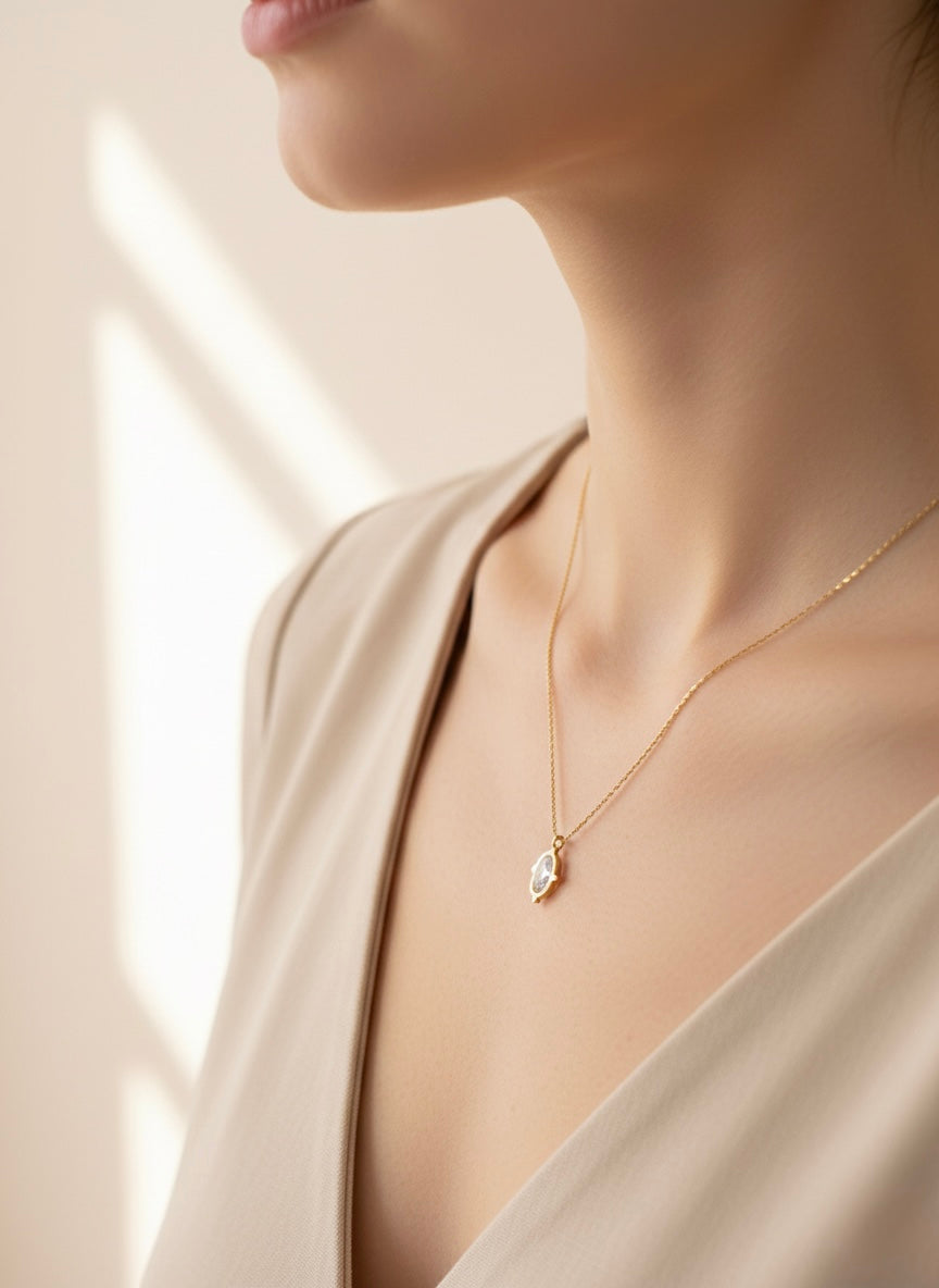 The oval diamond pendant acts as a mirror of light, capturing and reflecting brilliance with every movement. Its clean, elongated shape enhances the stone’s natural elegance, creating a timeless piece that feels both modern and otherworldly.